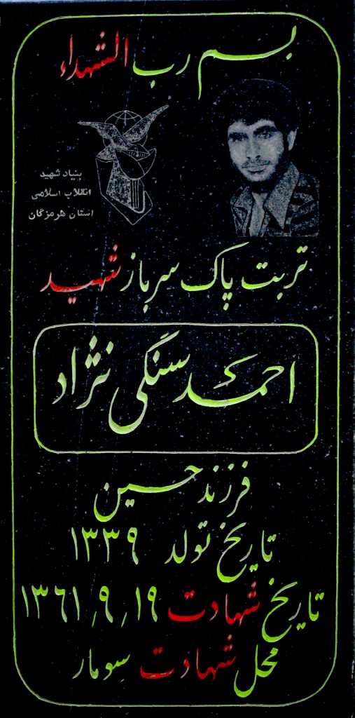 شهید احمد سنگی نژاد در چهارم اردیبهشت 1339، در روستای خورگو از توابع شهرستان بندرعباس چشم به جهان گشود . پدرش حسین ،کارگر بود و مادرش شیرین نام داشت . تا پایان دوره متوسطه در رشته اقتصاد درس خواند و دیپلم گرفت . به عنوان  سرباز ارتش در جبهه حضور یافت . هجدهم آذر 1361، در سومار توسط نیروهای عراقی بر اثر گلوله به قلب ، شهید شد . مدفن او در گلزار شهدای شهرستان زادگاهش واقع است .