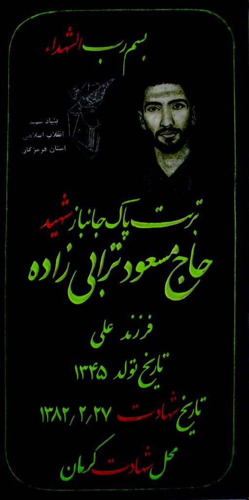 شهید حاج مسعود ترابی زاده ، در یکم فروردین 1345، در شهرستان کرمان دیده به جهان گشود . پدرش علی ، معلم بود و مادرش زینب نام داشت . تا پایان دوره کارشناسی در رشته علوم سیاسی درس خواند . مدیر عامل شرکت حمل و نقل جاده ای و صاحب امتیاز دفتر خدمات مسافرت هوایی بود . سال 1380 ازدواج کرد . به عنوان بسیجی در جبهه حضور یافت . دوازدهم اسفند 1365، با سمت تخریب چیدر شلمچه بر اثر اصابت گلوله به پهلو و کمر ، قطع نخاع و به درجه جانبازی نائل شد . بیست و هفتم اردیبهشت 1382 ، در محور سیرجان – بندرعباس دچار سانحه رانندگی و ضربه مغزی شد و پس از انتقال به بیمارستان زادگاهش به شهادت رسید . مزارش در گلزار شهدای شهرستان بندرعباس واقع است .