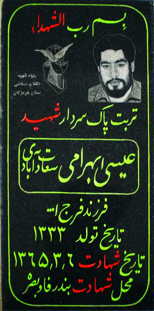 شهید عیسی بهرامی سعادت آبادی در بیستم دی 1332، در شهرستان آبادان چشم به جهان گشود . پدرش فرج الله ،کارگری می کرد و مادرش شوکت نام داشت . تا پایان دوره ابتدایی درس خواند . کارمند شیلات بود . سال 1356، ازدواج کرد و صاحب سه پسر و سه دختر شد . از سوی بسیج در جبهه حضور یافت . ششم خرداد 1365، با سمت معاون فرماندهگردان در فاو عراق بر اثر اصابت ترکش به سر، شهید شد . مزار وی در گلزار شهدای شهرستان بندرعباس واقع است .