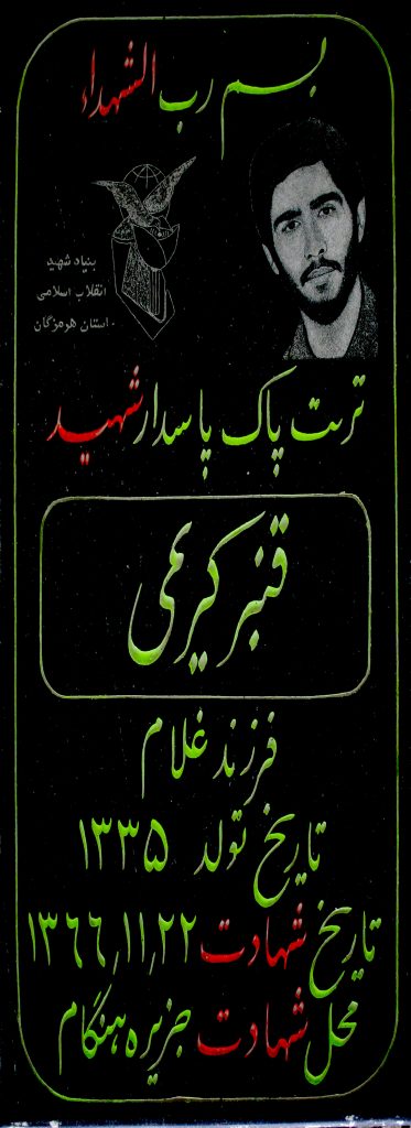 شهید قنبر کریمی ، یکم تیر 1325، در شهرستان بندرعباس دیده به جهان گشود . پدرش غلام و مادرش فاطمه نام داشت . تا پایان دوره ابتدایی درس خواند . راننده بود . سال 1355 ازدواج کرد و صاحب دو پسر و یک دختر شد . بیست و چهارم بهمن 1366 ، در جزیره هنگام حین انجام ماموریتی که از سوی بسیج به او واگذار شده بود، بر اثر سانحه رانندگی رانندگی و آسیب به سر و گردن و قطع نخاع ، شهید شد . پیکر او را در گلزار شهدای زادگاهش به خاک سپردند .