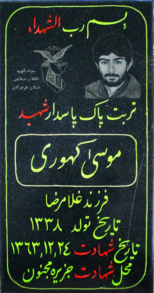 شهید موسی کهوری در دوم شهریور 1338، در روستای گردکن از توابع شهرستان حاجی آباد دیده به جهان گشود . پدرش غلامرضا، کارگر بود و مادرش هاجر نام داشت . تا پایان دوره راهنمایی درس خواند . سال 1360،ازدواج کرد . به عنوان پاسدار در جبهه حضور یافت . بیست و چهارم اسفند 1363، در جزیره مجنون عراق بر اثر اصابت ترکش به کتف و سر، شهید شد . پیکرش را در گلزار شهدای شهرستان بندرعباس به خاک سپردند .